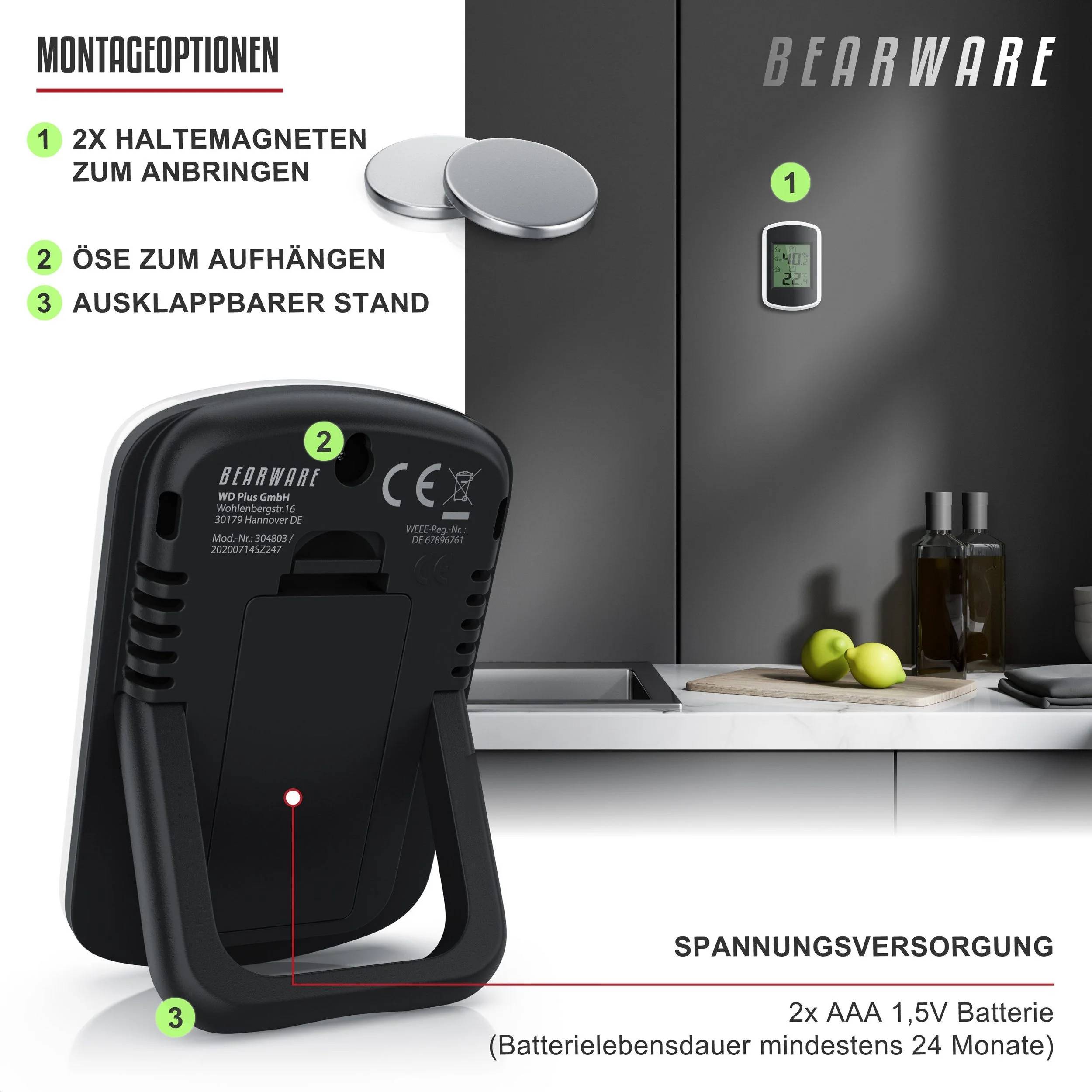 Dank zweier beiliegender Magnete sowie dem integrierten Standfuß kann das Messgerät flexibel aufgestellt oder an metallischen Oberflächen befestigt werden. Der Betrieb erfolgt über zwei AAA-Batterien und garantiert eine lange Laufzeit – ideal für dauerhafte Raumklimaüberwachung.