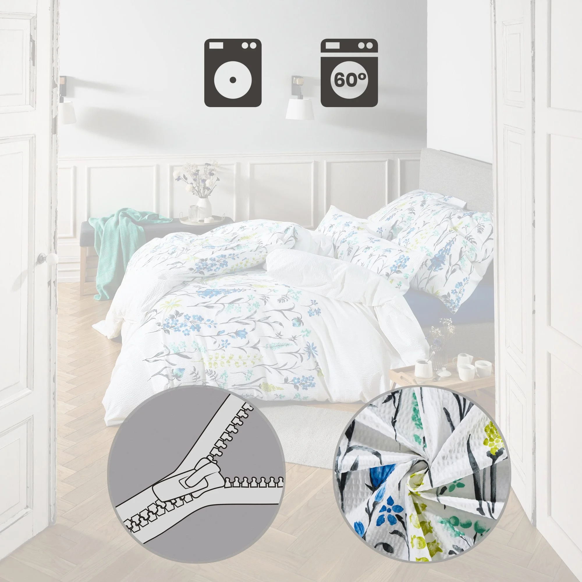 Highlights: Frisches Blumenmotiv, luftige Seersucker-Struktur, ideal für Sommernächte, pflegeleicht & bügelfrei, zwei Designs in einem Bezug.